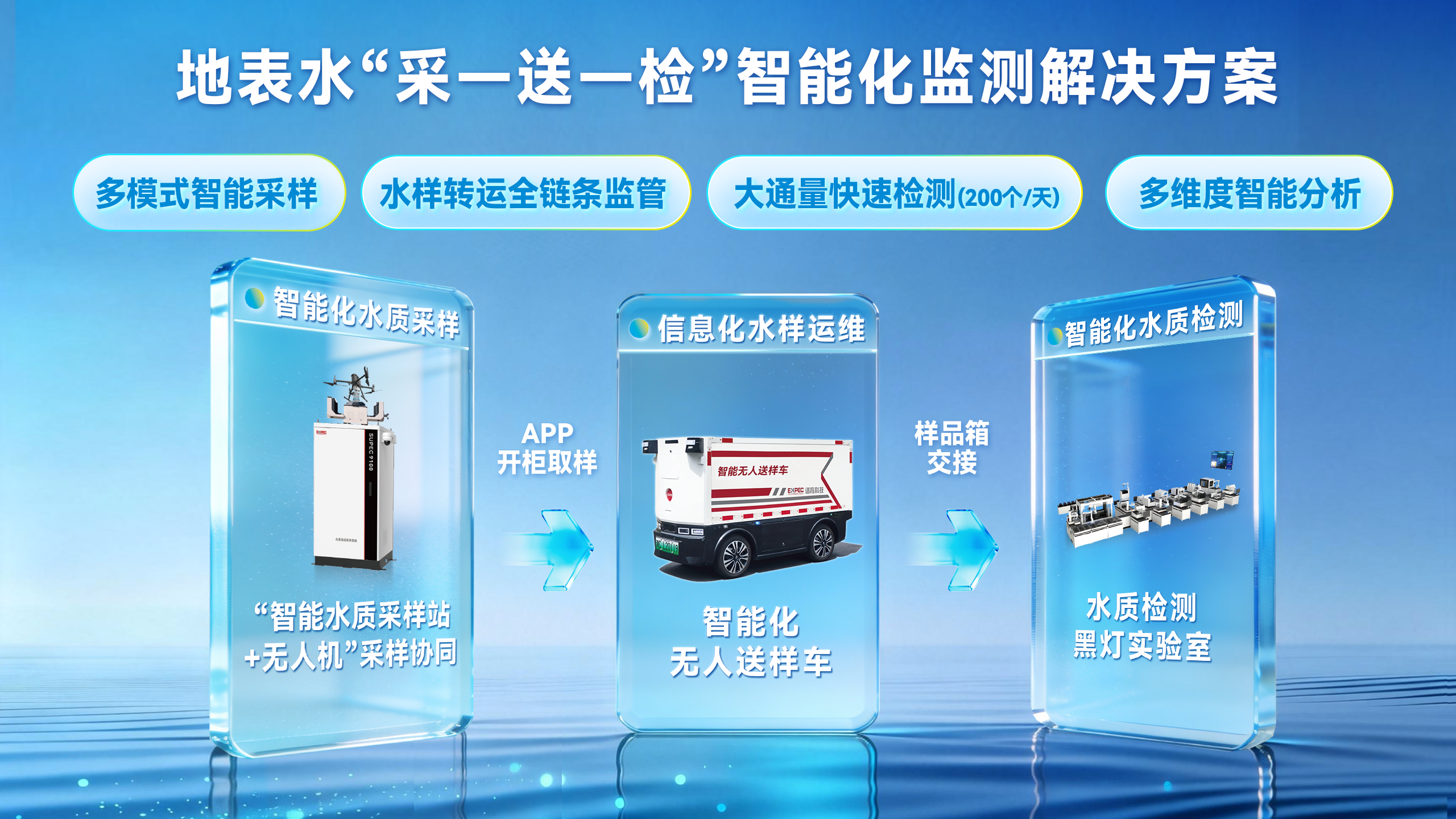 以采样端标准化、运输端全程追溯、实验室端无人值守为核心,聚光科技构建覆盖现场、运输与实验室的一体化方案,推动水质监测从“单机应用”走向“系统协同”,实现水样从现场采集到检测结果的全流程闭环。
