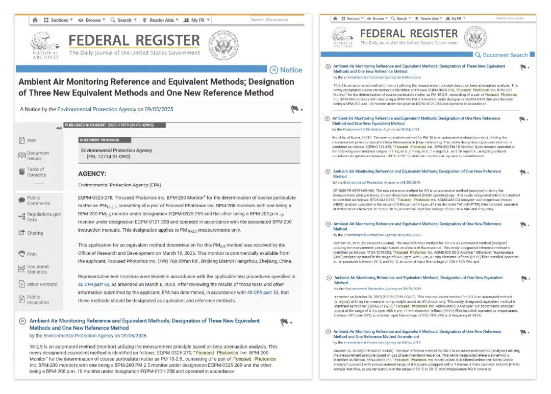 聚光科技PM2.5大气颗粒物分析仪与AQMS全系列已通过US EPA认证,并正式列入联邦注册公告